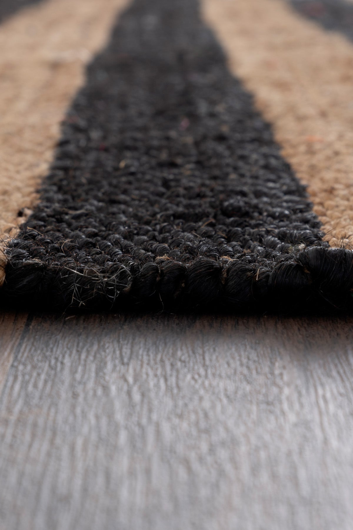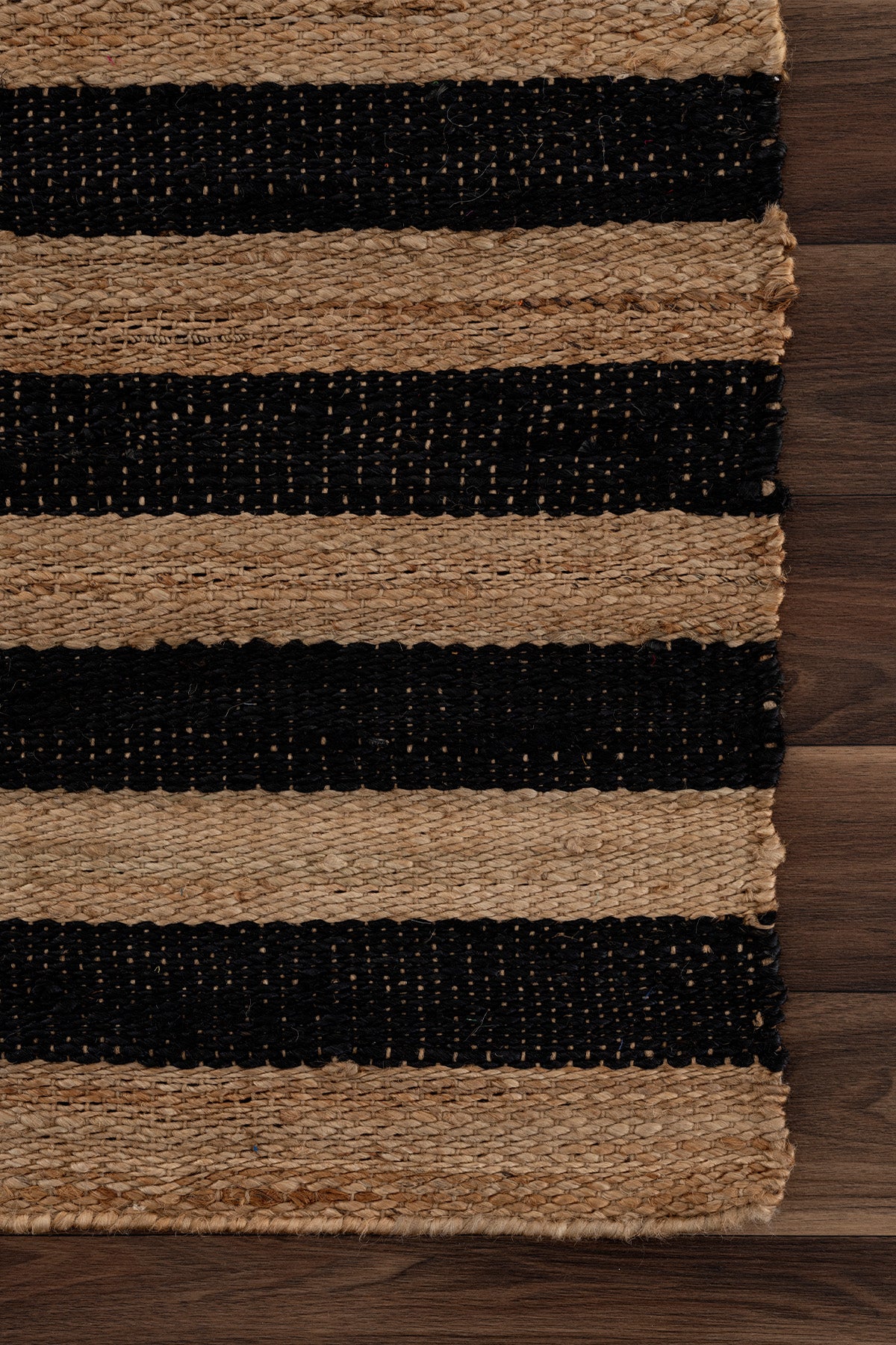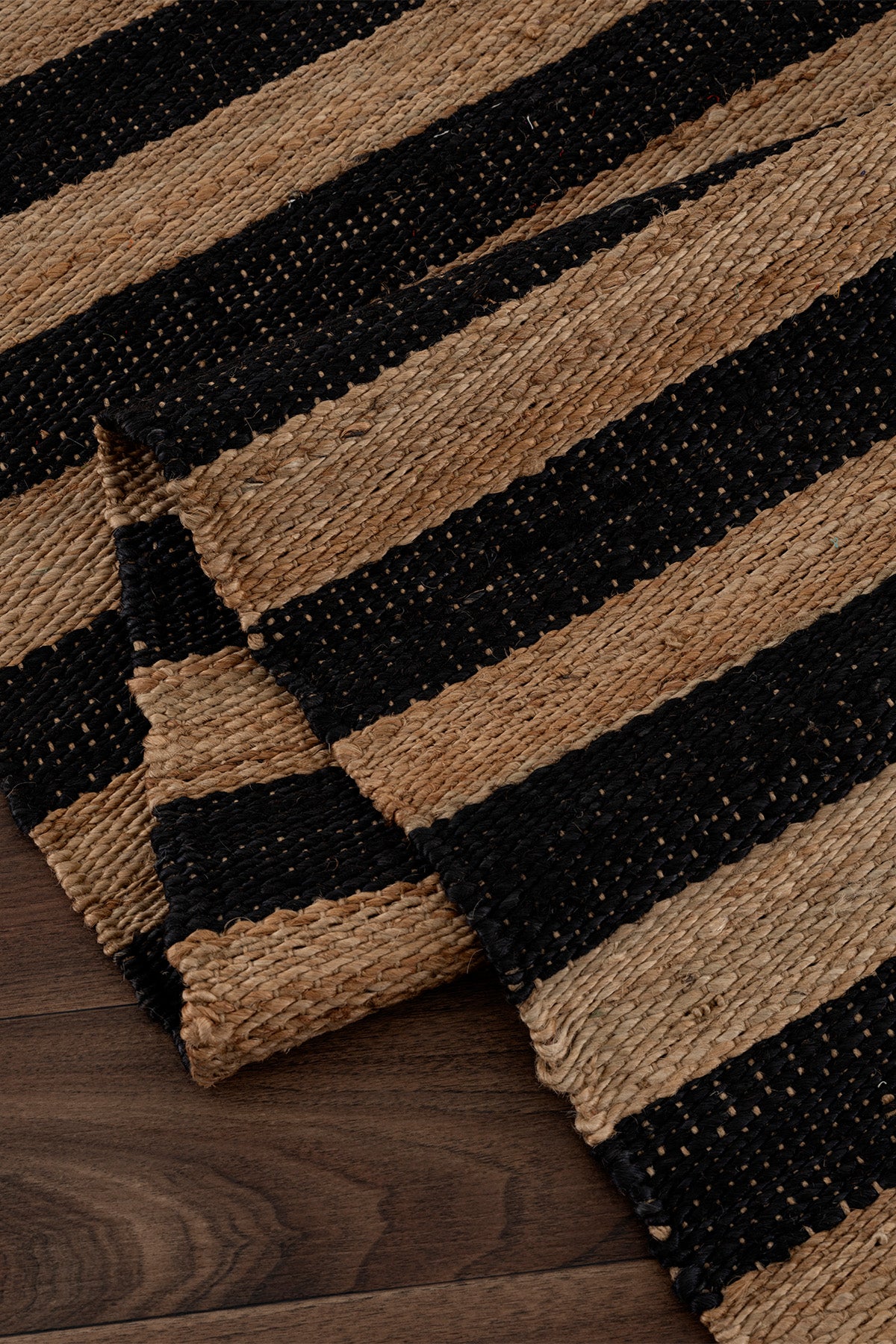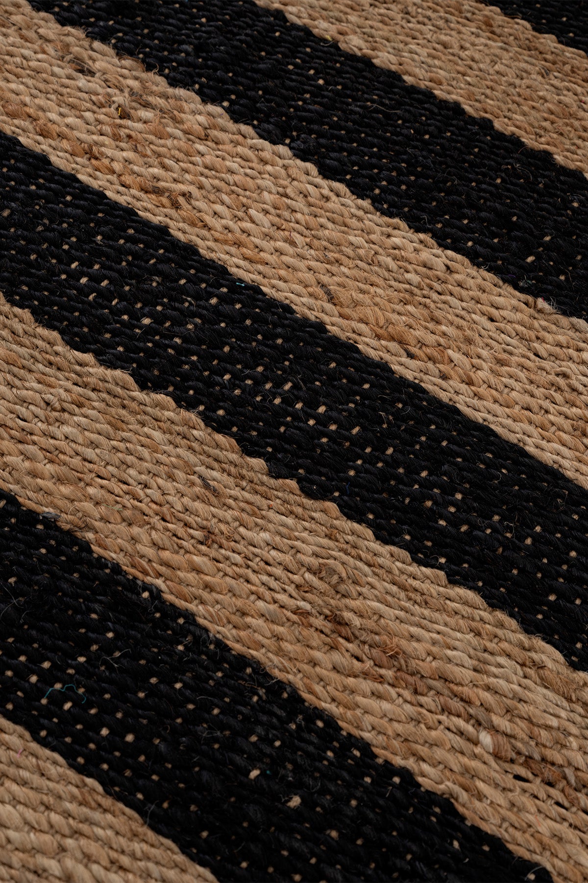 - Çizgisel formadaki dokuması siyah ve doğal jütün uyumunu sergiler.
