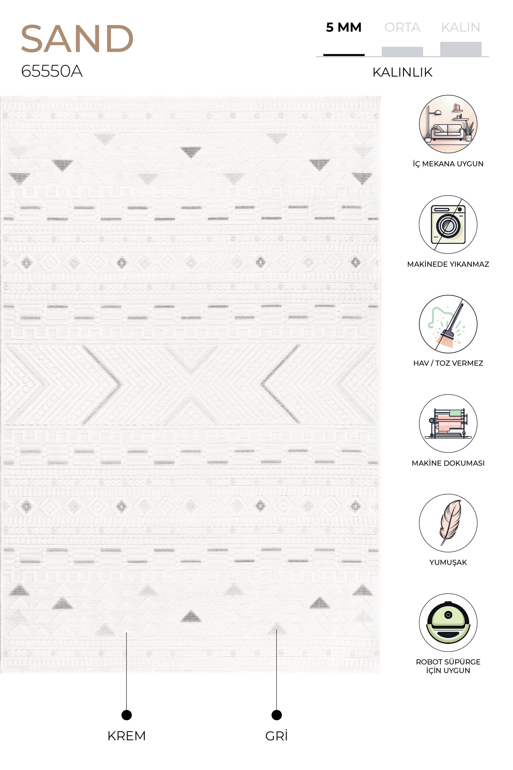 Sand Krem Gri Temizlenebilir Halı 65550A