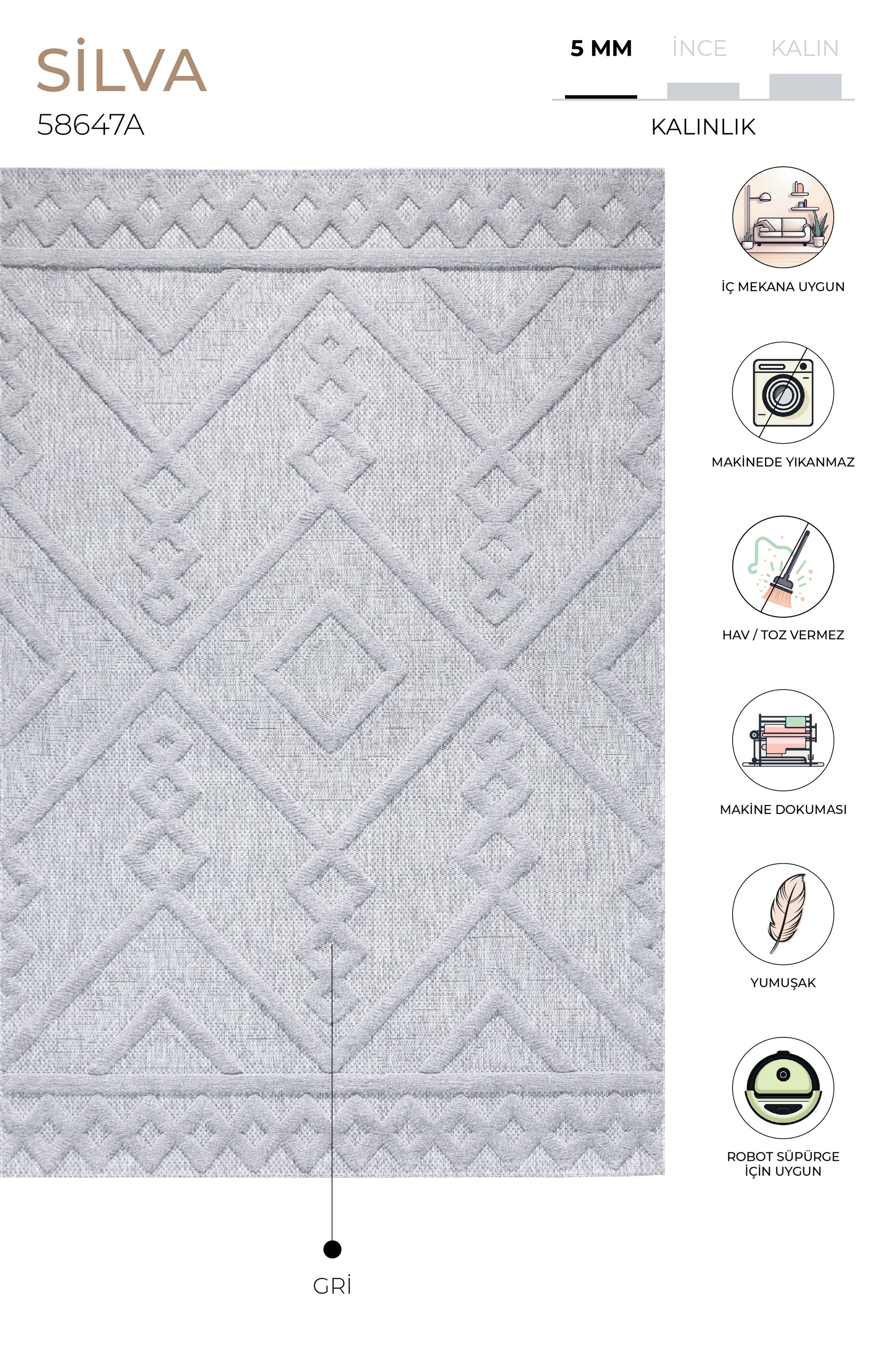 Silva halılarımız doğal renk geçişleriyle mekânlara çağdaş ve modern bir doku katan, tüy dökmeyen çift katmanlı yapısı ile kullanıcı dostu, konforlu bir tasarım sunuyor.